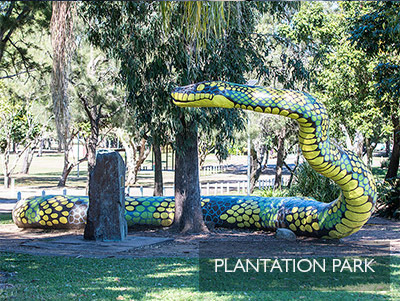 A meeting place for a variety of activities, Plantation Park is the home to the Burdekin Visitor Centre, Plantation Nature Play – a state-of-the-art nature based play area and Gubulla Munda, the much photographed, large carpet snake statue.